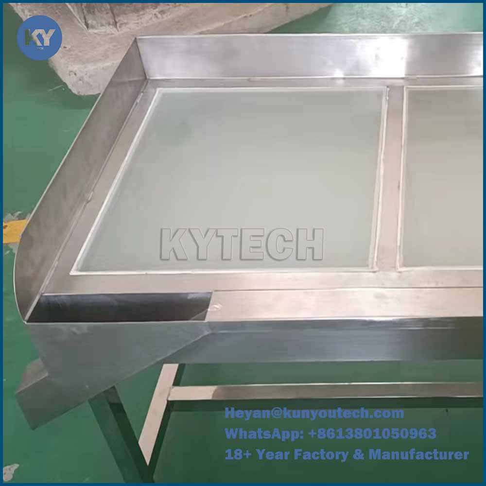 طاولة فحص الكبسولات الهلامية هي نوع من آلات الفرز المصممة خصيصًا لمصنعي الكبسولات الهلامية للحصول على كبسولات أفضل. سطح / غطاء طاولة الفحص مصنوع من أنبوب الفولاذ المقاوم للصدأ SUS304. على سطح الطاولة، توجد زجاج مصنفر. توضع الكبسولات على الزجاج المصنفر ويتم تشغيل المصباح. ثم ينظر المشغلون إلى الكبسولات ويحددون الكبسولات الأفضل من خلال شفافية الكبسولات. شفافية أفضل، كبسولات أفضل. يمكن لهذا النوع من طاولة فحص الكبسولات الهلامية أن يخفف من إجهاد العين لدى المشغلين لأن الأضواء ليست قوية جدًا.